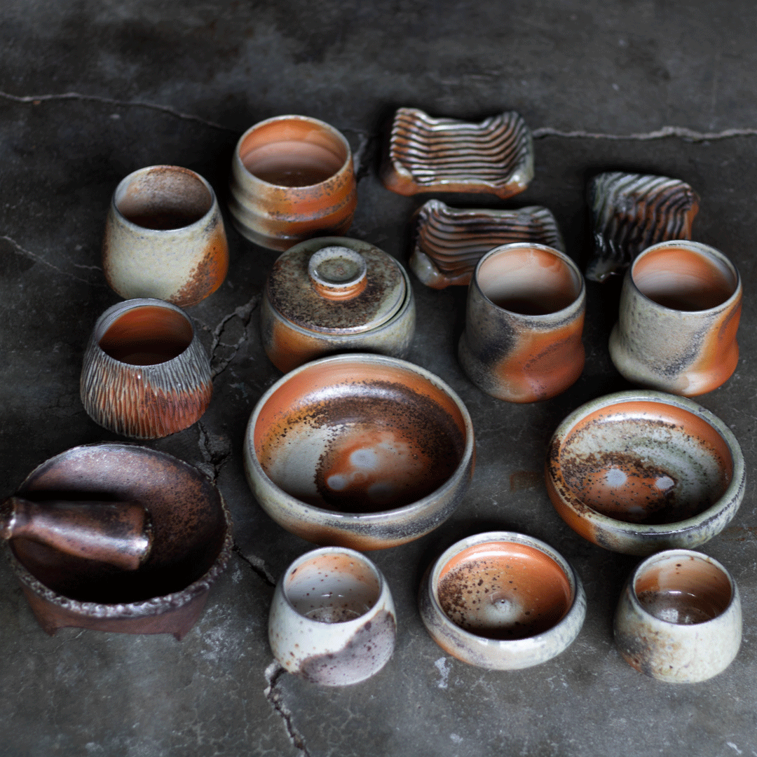 Each piece is uniquely painted by the atmosphere inside the kiln. Wood ash swirls inside the kiln, landing and collecting on the pottery which then melts at extreme heat forming a glazed surface. The flames create a flashing affect as it moves along the curves of the pieces that is stamped in time. Each piece is transformed by the alchemy within the kiln, making them truly unique and one-of-a-kind.